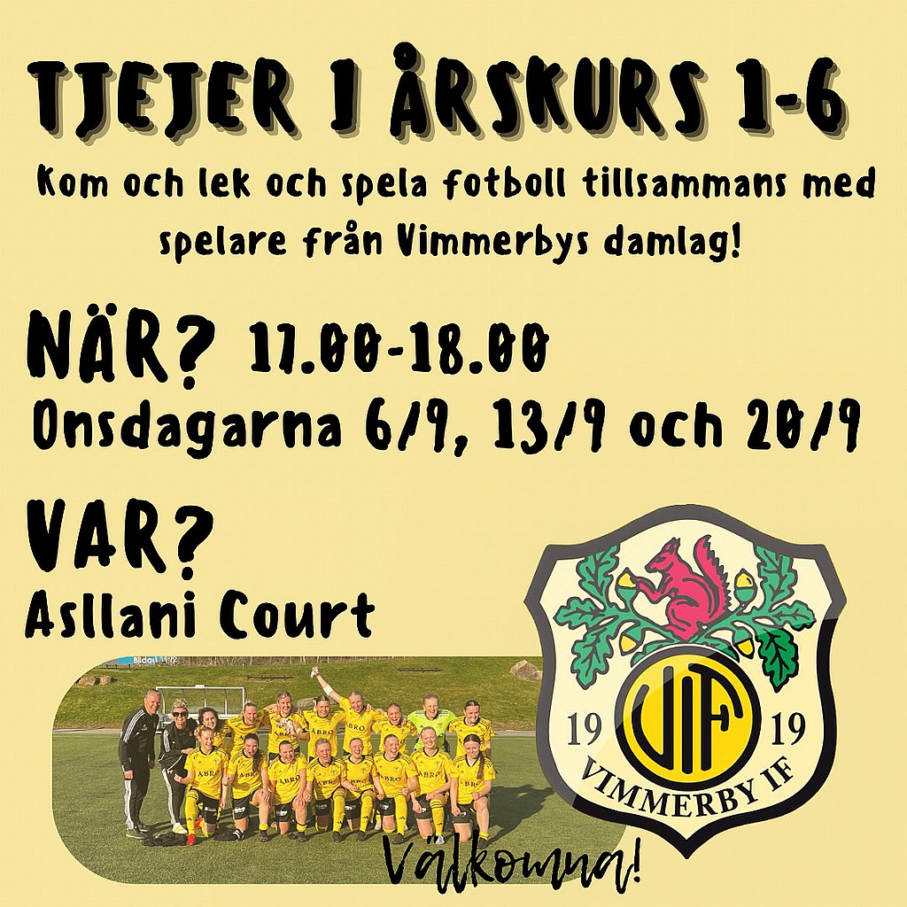 Från och med kommande onsdag och tre onsdagar framöver mellan klockan 17.00-18.00 är tjejer i årskurs 1-6 välkomna till Asllani Court för att leka och spela fotboll tillsammans med ett härligt gäng spelare från vårt damlag🌟