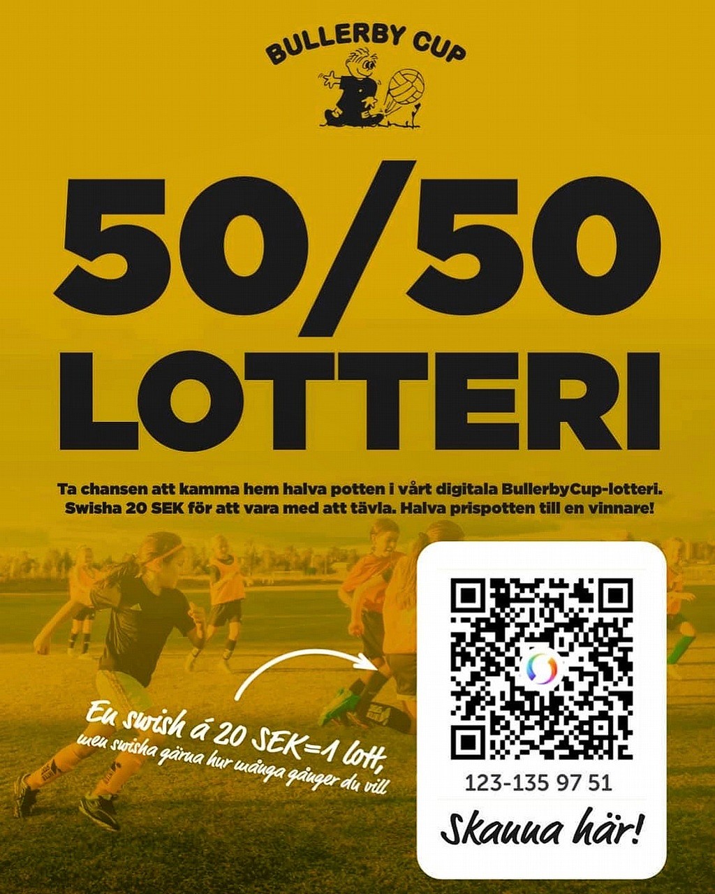 Ta chansen att vara med i vårt 50/50-lotteri under Bullerby Cup🍀🍀 En swish à 20 kr räknas som en lott! Du får swisha hur många gånger du vill- Ju fler lotter du köper desto större chans att kamma hem prispotten🎉