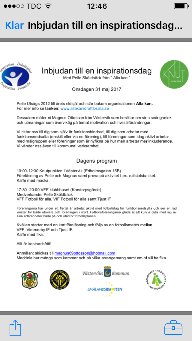 Onsdagen 31 maj blir det inspirationsdag i Västervik där Magnus och Pelle ska föreläsa om att "alla kan, inget är omöjligt". Målgruppen är personer med någon form av funktionsnedsättning eller som känner sig i utanförskap. VIF och VFF finns med i organisationsstaben kring dagsprogrammet och vi har idag bjudit in alla föreningar i Västervik, kommunala inrättningar som kan inhysa målgruppen mfl.
