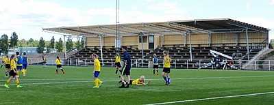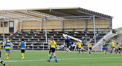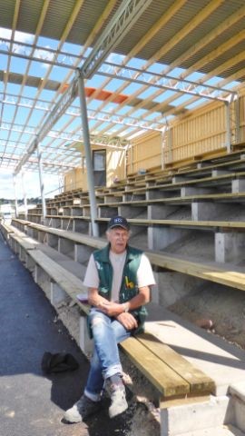 Nu har taket börjat läggas och i förra veckan har bänkarna fått nytt virke, byggherren Sören Isaksson /Rumskulla Maskiner/ har nu anställt rutinerade snickaren Per-Åke i Ekäng, denne man har alltid fart i sitt arbete och alltid några goda ord på vägen. Speakerbås byggs mitt på läktaren, blir kanon.