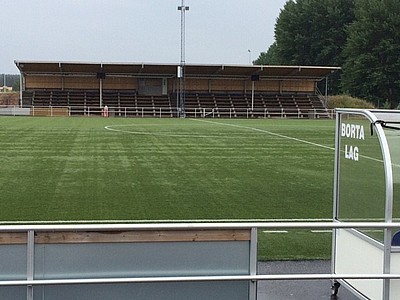 Det duggregnar men är inga problem, vi slipper bevattna konstgräset innan matchstart :-) och vi som är publik får ju tak över huvudet, läktaren slukar upp mot 600 personer, så det är bara att tränga ihop sig,