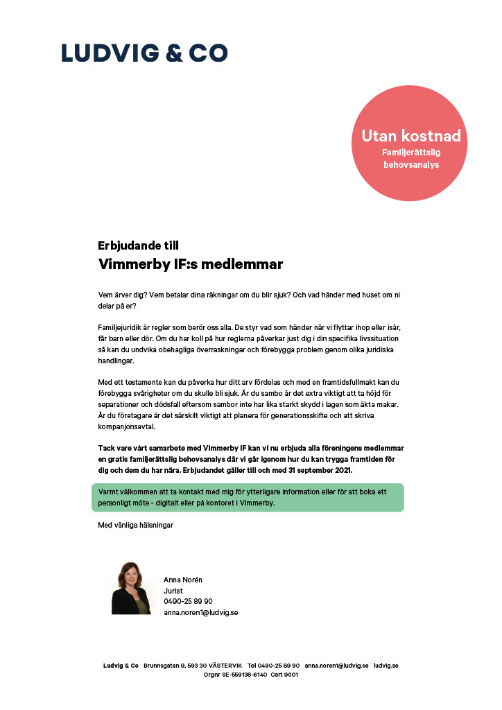 Tack vare vårt samarbete med Vimmerby IF kan vi nu erbjuda alla föreningens medlemmar en gratis familjerättslig behovsanalys där vi går igenom hur du kan trygga framtiden för dig och dem du har nära. Erbjudandet gäller till och med 30 september 2021.