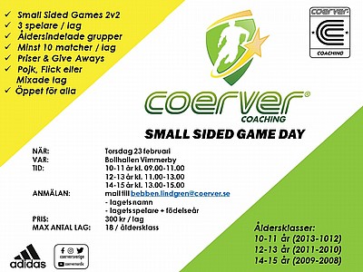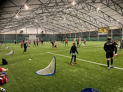 I måndags var ca 50 spelare med Coerver och tränade fotboll i bollhallen. På Sportlovet kommer de tillbaka med smålagsspel i tre olika åldersklasser. Lag med tre spelare får anmäla sig och sedan spela 2v2-matcher i turneringsform.